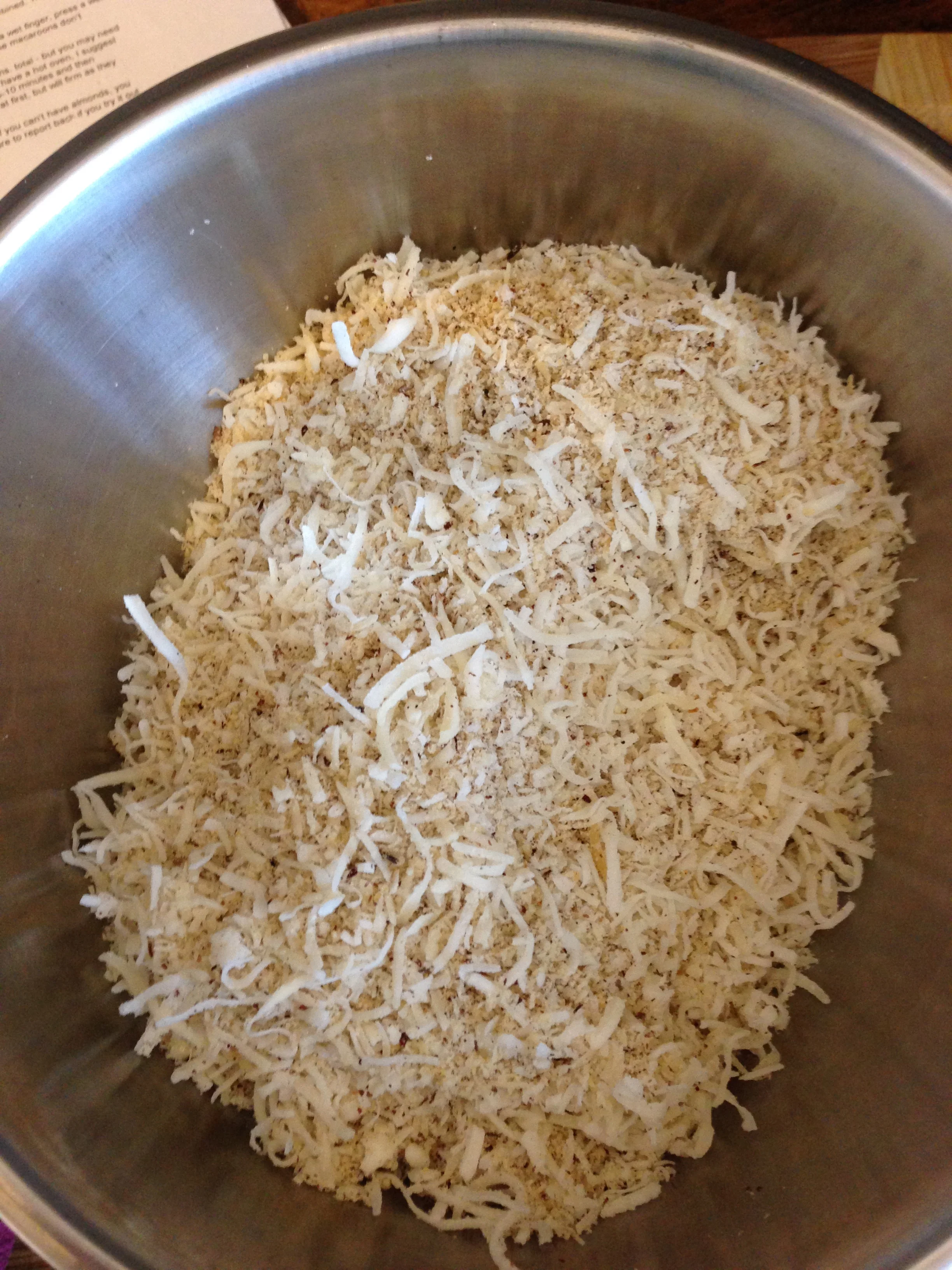 In a bowl ,add the coconut flakes, salt and flour. Mix them together.