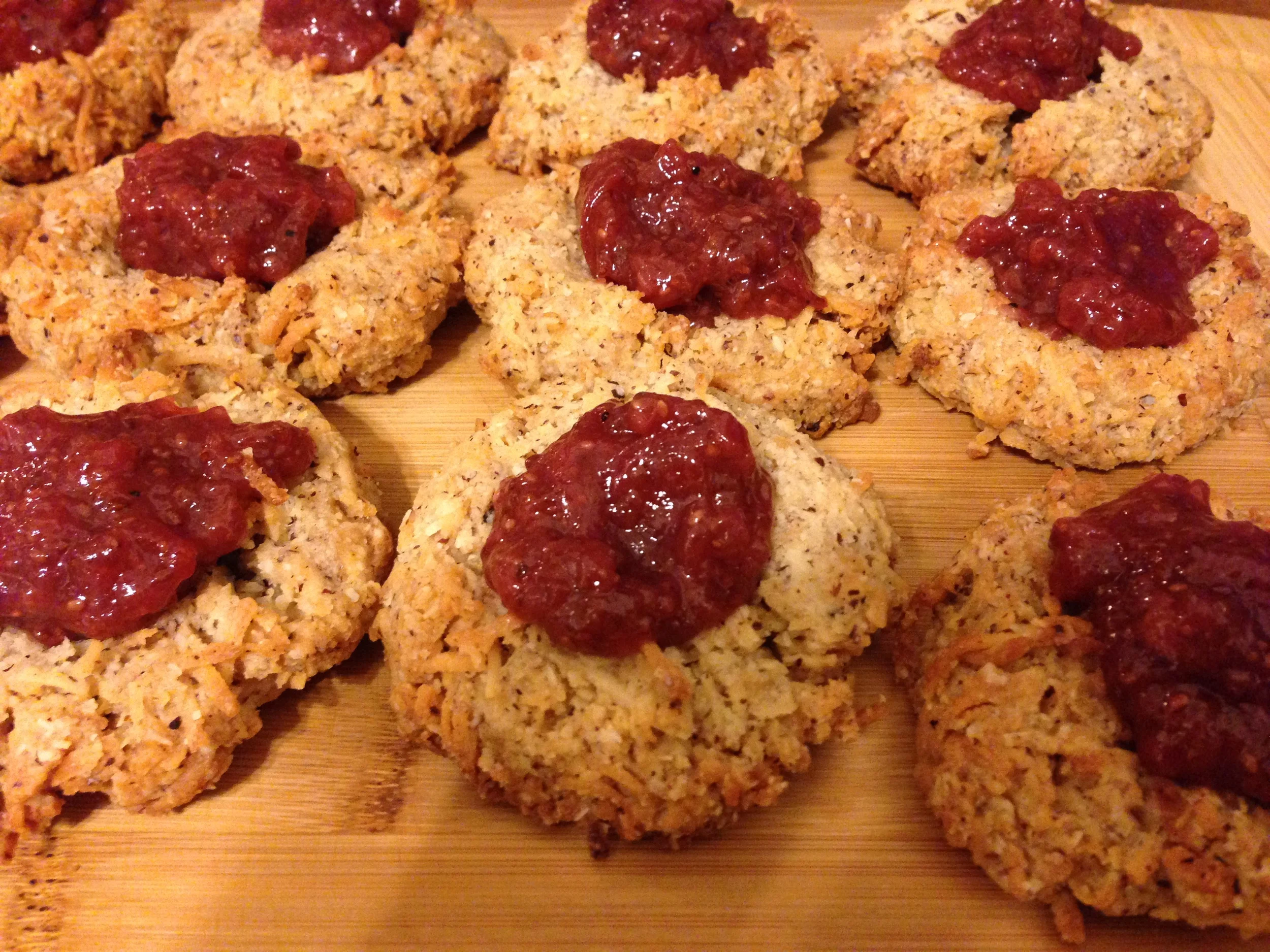 Grab a ping pong sized bit of the mix in your hand and place in on the cookie sheet. Press your finger into the middle of the cookie to create a home for the jam. You may want to reshape the sides of the cookie a bit. They may crack a bit. Also, the dough may be a little sticky. That;s perfect! Just make sure to wet your hands while playing with it. Proceed with all the mix.
