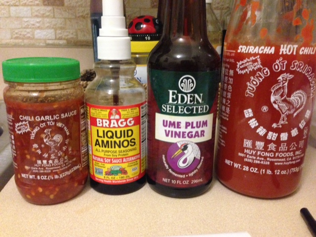 After 3 to 4 minutes off sautéing, add the noodles, 2 tb of Ume Vinegar, 4 to 6 pumps of Aminos and 2 Tb of soy sauce and toss until the noodles are hot and moist.