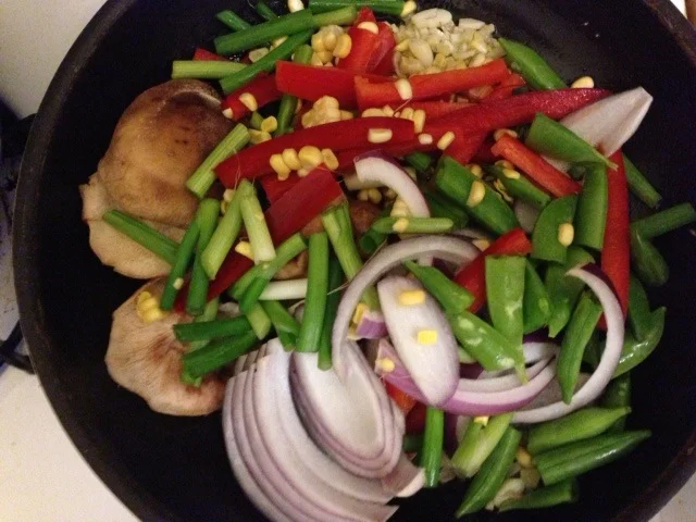 Place 2 Tb of safflower oil in a sauté on high heat and toss those veggies in there.