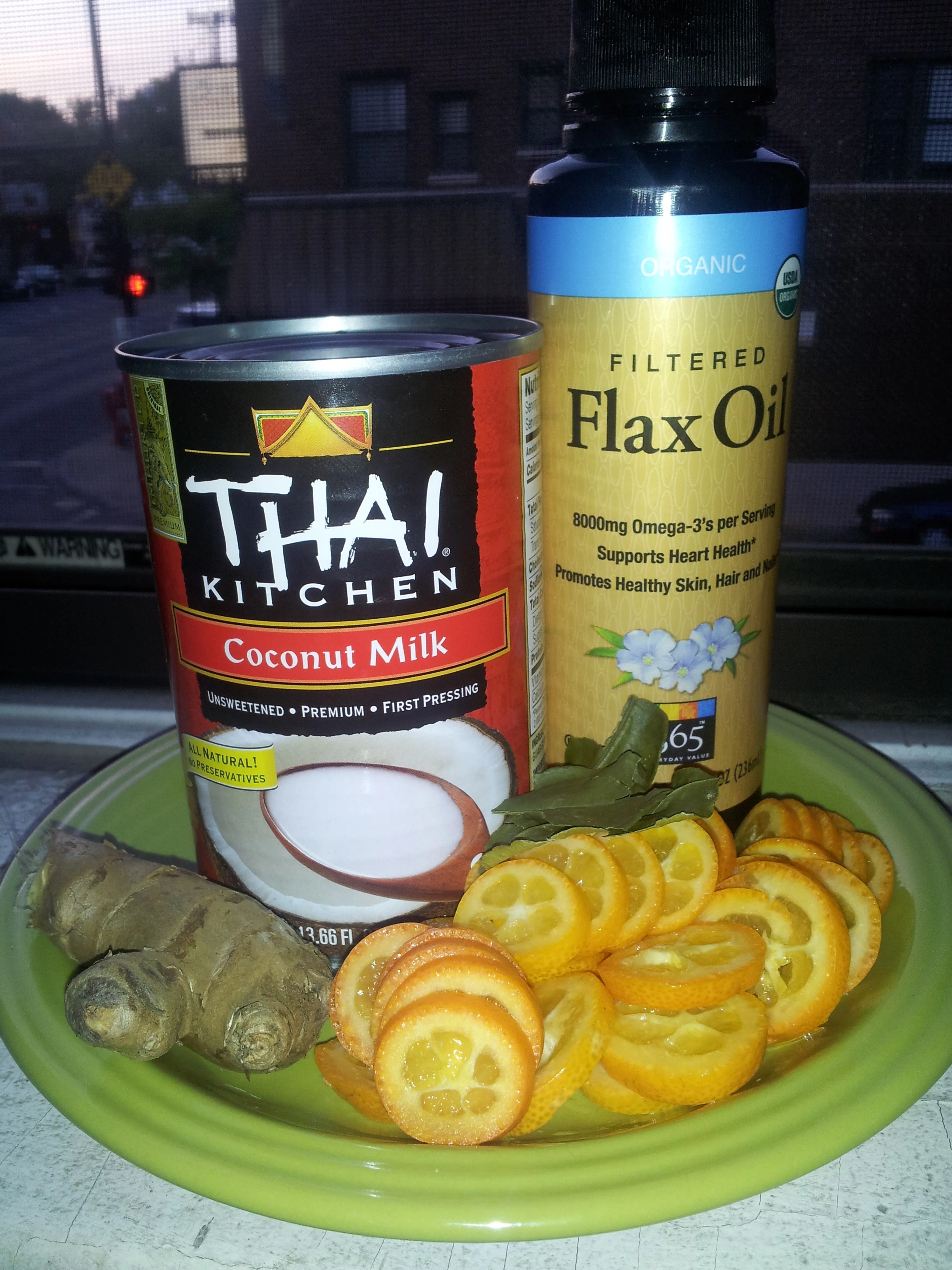*Heat oil in a sauce pan. Add garlic, ginger, and lemongrass and cook until transparent and aromatic. Then add the kaffir leaves and kumquats. Cook for 4 minutes on medium heat.