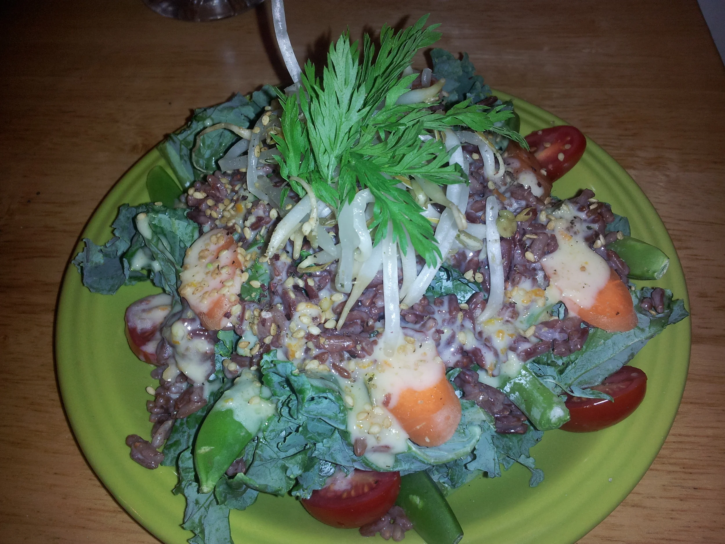 * Assemble the salad with what ever fixing you wish. I laid down a bed of fresh kale, 2 scoop of coconut ruby rice, tear drop tomatoes, snap peas, heirloom carrots, bean sprouts and some of that Creamy Kumquat Dressing!!