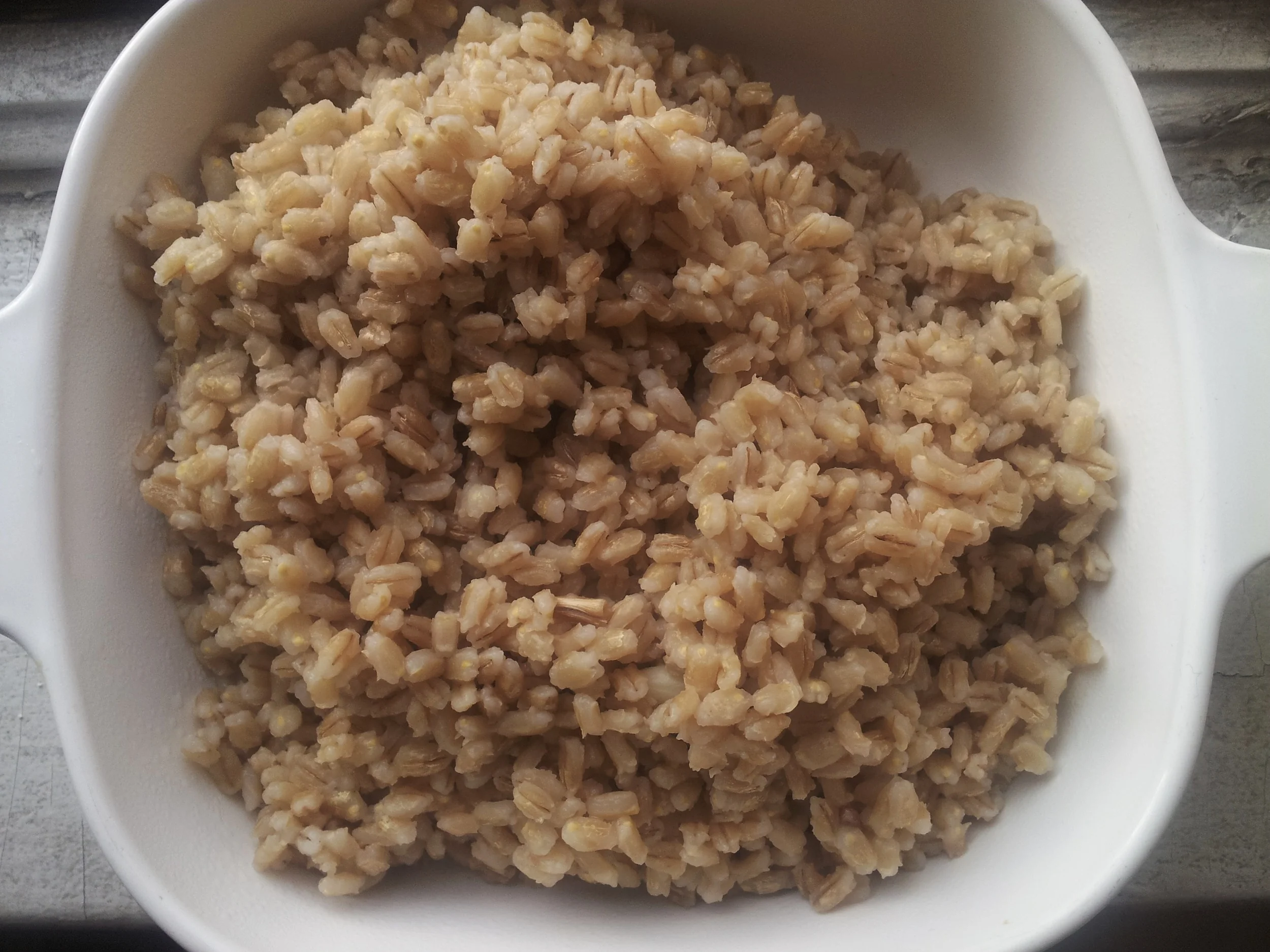 *First rinse the wheat berries (if you have time, soak them overnight to cut down your cooking time). Add the water, smashed garlic and wheat berries together in a small pot. Cook on medium low heat for about 40 to 45 minutes.